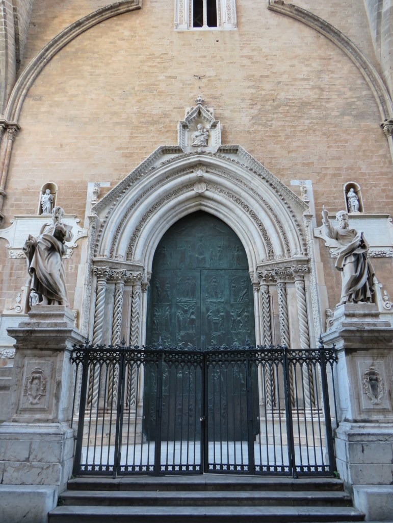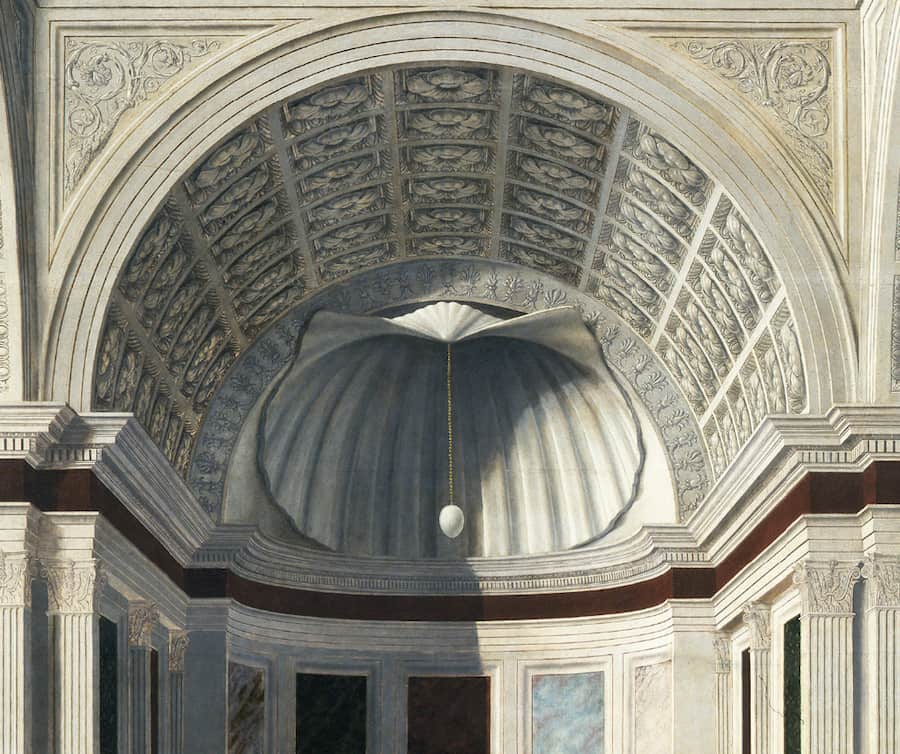 Ma per completare, solo per il momento, il nostro viaggio a Brera ci lasciamo rapire dalla parte superiore della “Pala” di Piero dove sono le architetture a farla da padrone. Al di sopra di marmi policromi si apre una volta a botte con lacunari e subito sotto una conchiglia, dove appare straordinario il gioco di luce sullo sfondo che sembra quasi rendere fotografica la spazialità intorno a questo uovo di struzzo pendente (vari i significati di quest’ultimo, dalla rinascita alla redenzione al rimando della maternità di Battista Sforza).