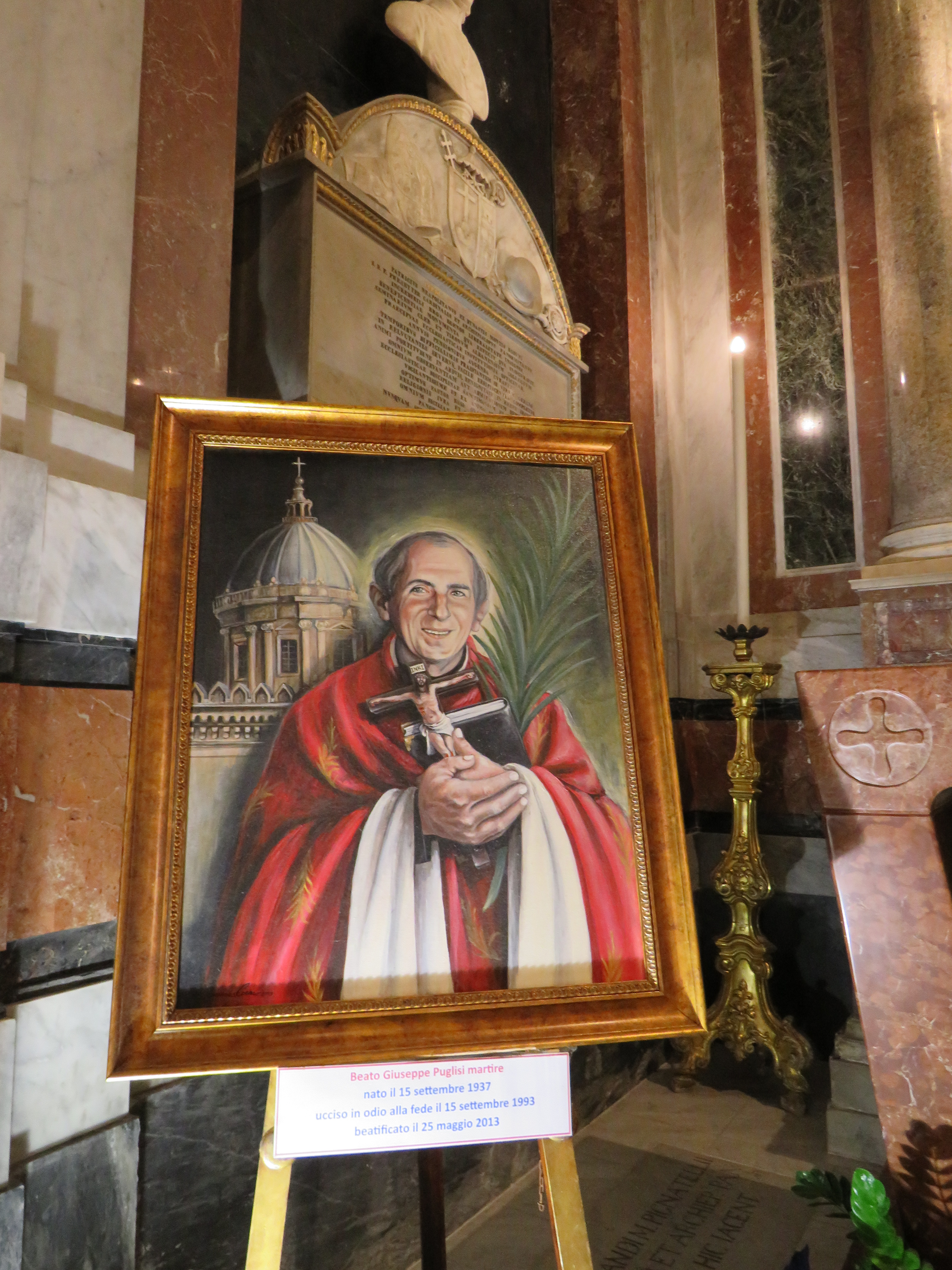 In primo piano un uomo inginocchiato in armatura con mani giunte, la protezione delle mani e l’elmo sono stati riposti sul pavimento e questo permette di scorgere il profilo inconfondibile del committente, Federico da Montefeltro.