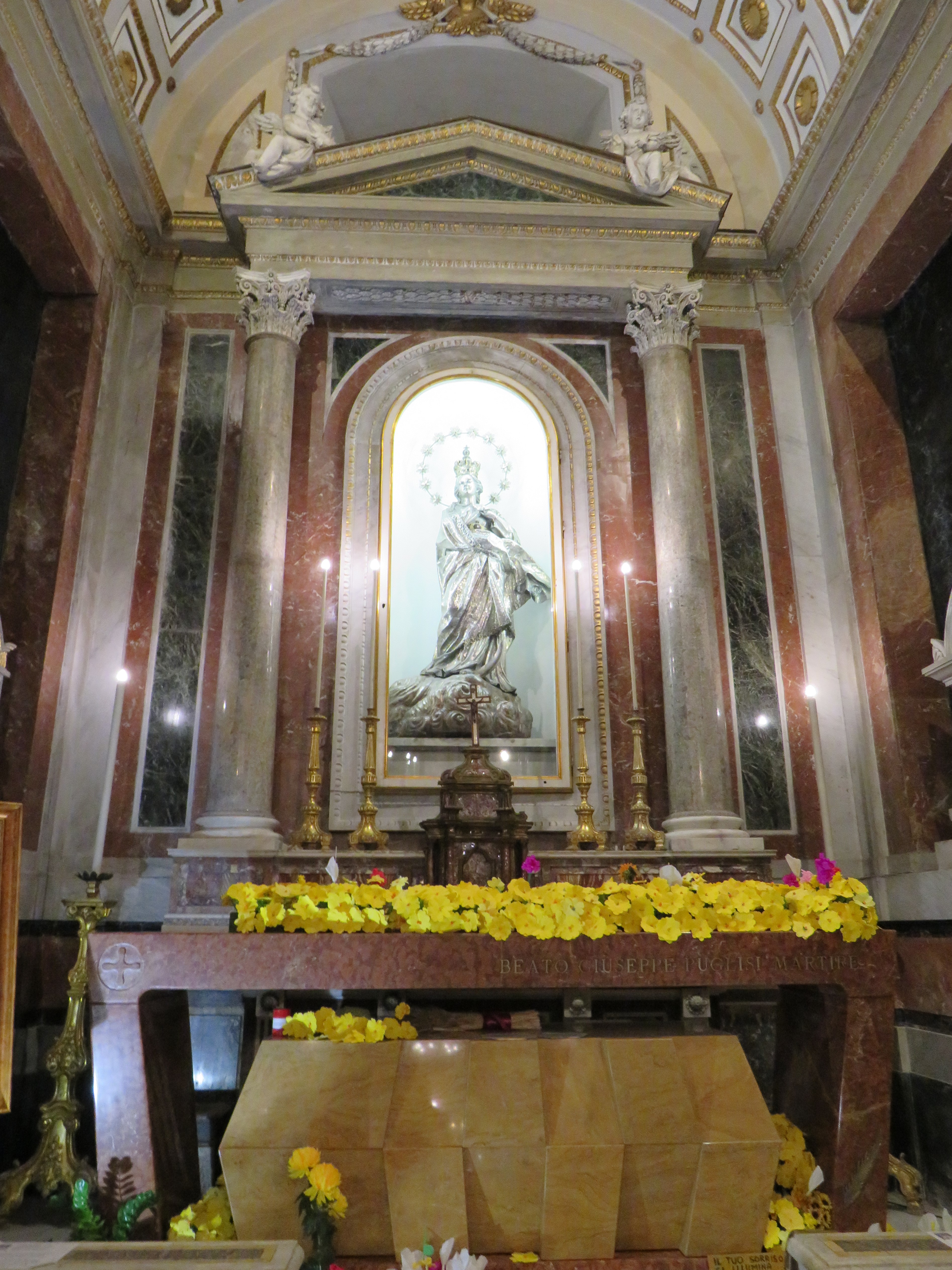 Su di un trono è posta la Vergine (il cui volto è via di fuga dell’opera) con Bambino (di gusto fiammingo quel tappeto posto in basso) e attorno a Maria tutta una serie di figure nelle quali si riconoscono da sinistra Giovanni Battista, San Bernardino, San Girolamo (con vesti da eremita ed il sasso del penitente), quattro figure angeliche con vesti rinascimentali, San Francesco d’Assisi che mostra le stimmate, San Pietro Martire con la ferita sul capo e l’ultimo a destra San Giovanni Evangelista.